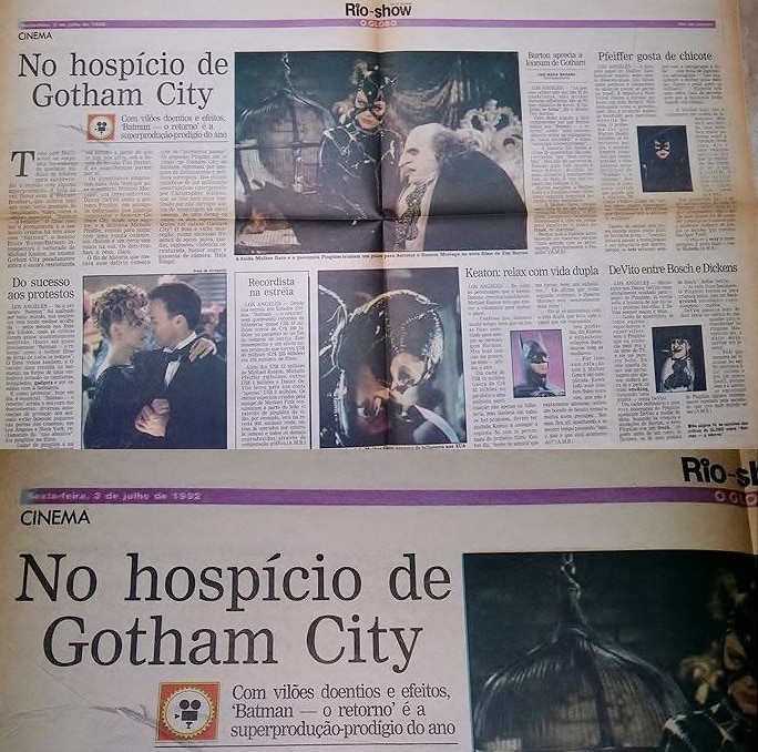 Eu guardo a matéria do jornal sobre a estreia do filme, meses antes do meu aniversário de 9 anos. O meu pai me presenteava na época com tudo relacionado ao homem-morcego, quadrinização oficial por Dennis O’Neil e Steve Erwin, cartucho do jogo para SNES, bonecos, revistas de cinema que estampavam nas capas o Michael Keaton e a Michelle Pfeiffer, em suma, combustível suficiente para a expectativa cinéfila. Mas eu não vi “Batman – O Retorno” no cinema, o meu primeiro contato com ele foi deitado na cama dos meus pais, no dia do meu aniversário, com o VHS reservado semanas antes na “RG Vídeo Locadora”, do amigo Ricardo.