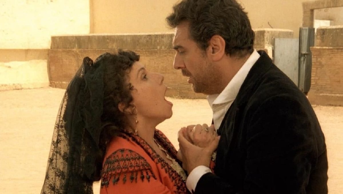 Don Jose (Plácido Domingo) é um soldado que se apaixona por Carmen (Julia Migenes), uma operária de fábrica. Porém, o soldado não tem seu amor correspondido. Ópera de GEORGES BIZET, dirigida por FRANCESCO ROSI.